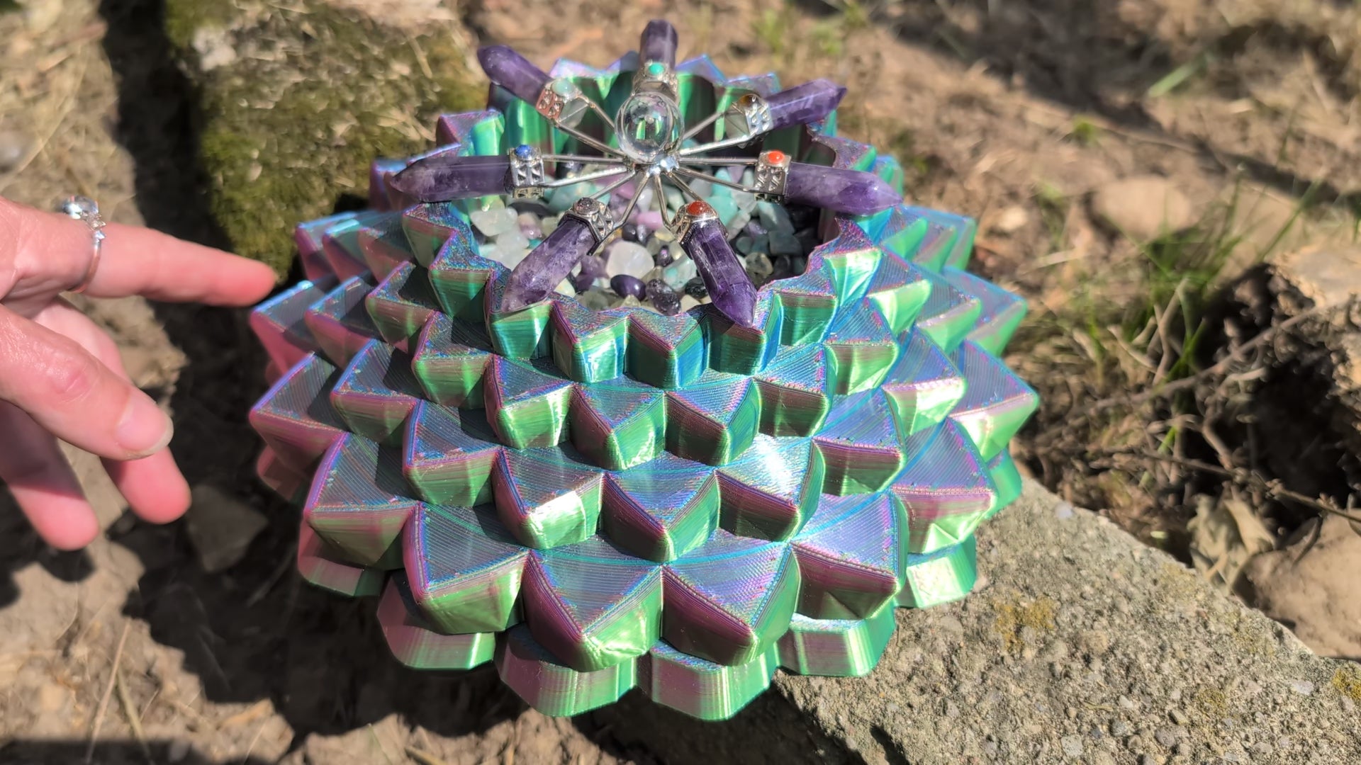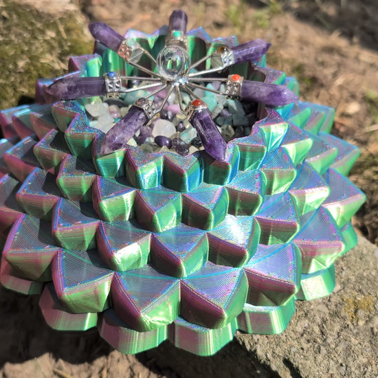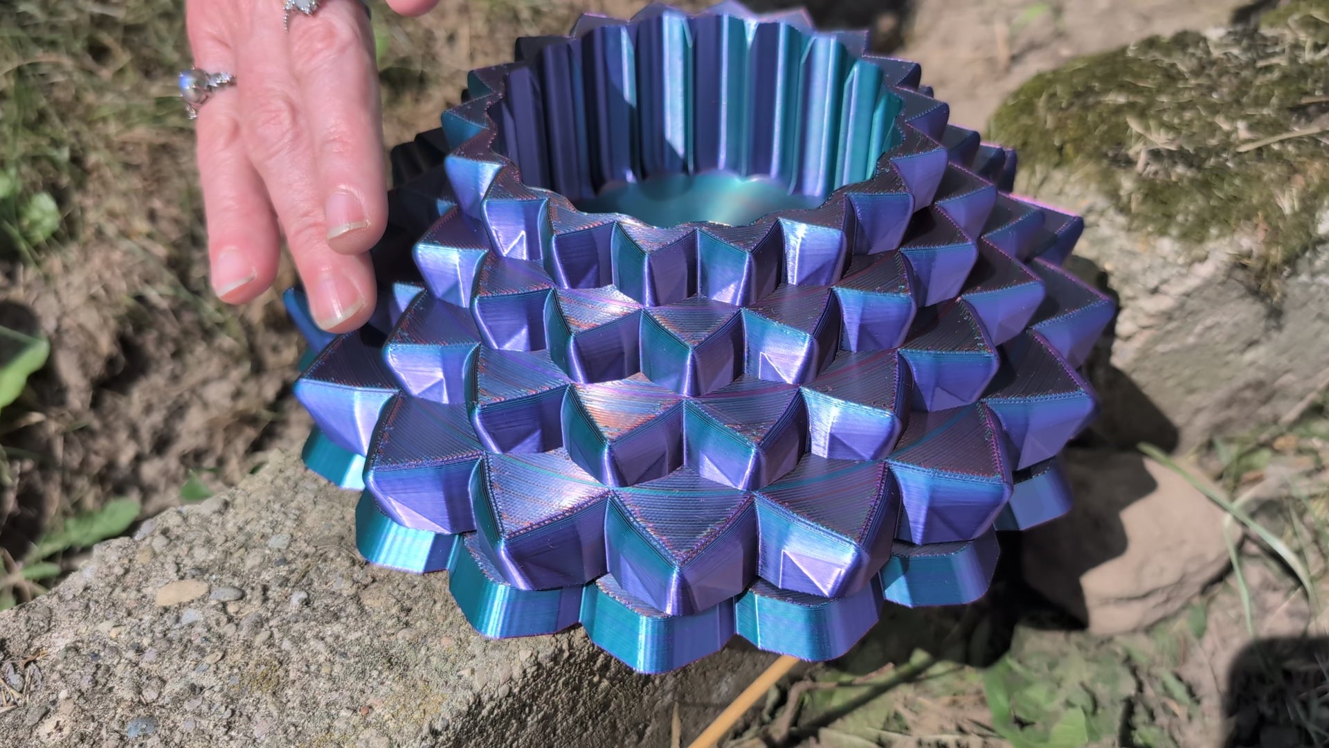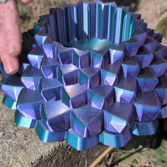 A geometrically unique display bowl 3d-printed in 3-color silk. The upper part appears to change colors as it spins. Use it as is, or to hold an LED candle, wrapped candies, tumbled stone, or maybe a crystal sphere.